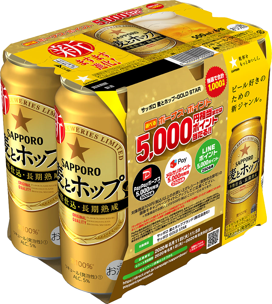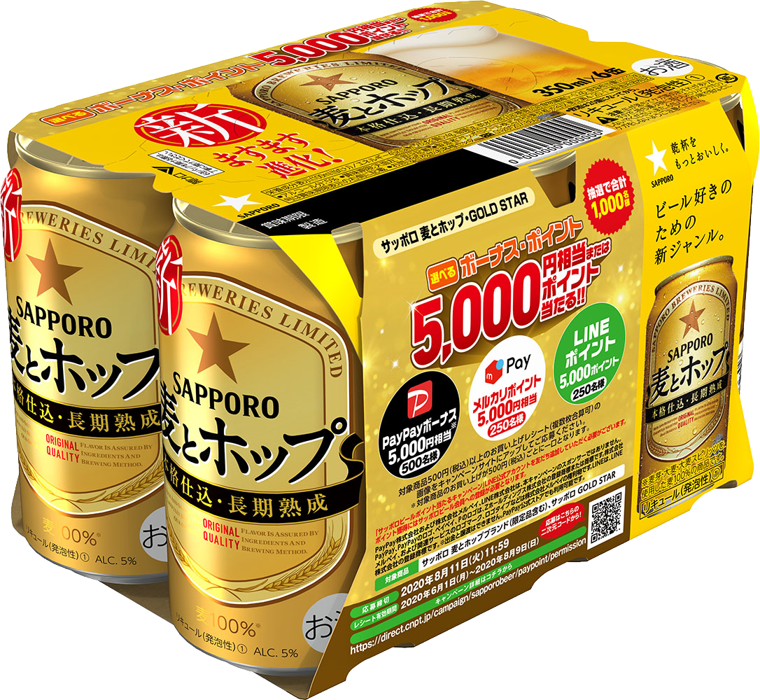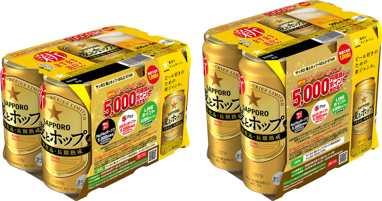 サッポロビール(株)は、「サッポロ 麦とホップ」と「サッポロ GOLD STAR」を対象とした「選べるボーナス・ポイント5,000円相当またはポイント当たる!!」キャンペーンを実施します。また、キャンペーンの実施に合わせ、サッポロ 麦とホップ「選べるボーナス・ポイント5,000円相当またはポイント当たる!!」キャンペーンパックを6月2日から全国で販売します。