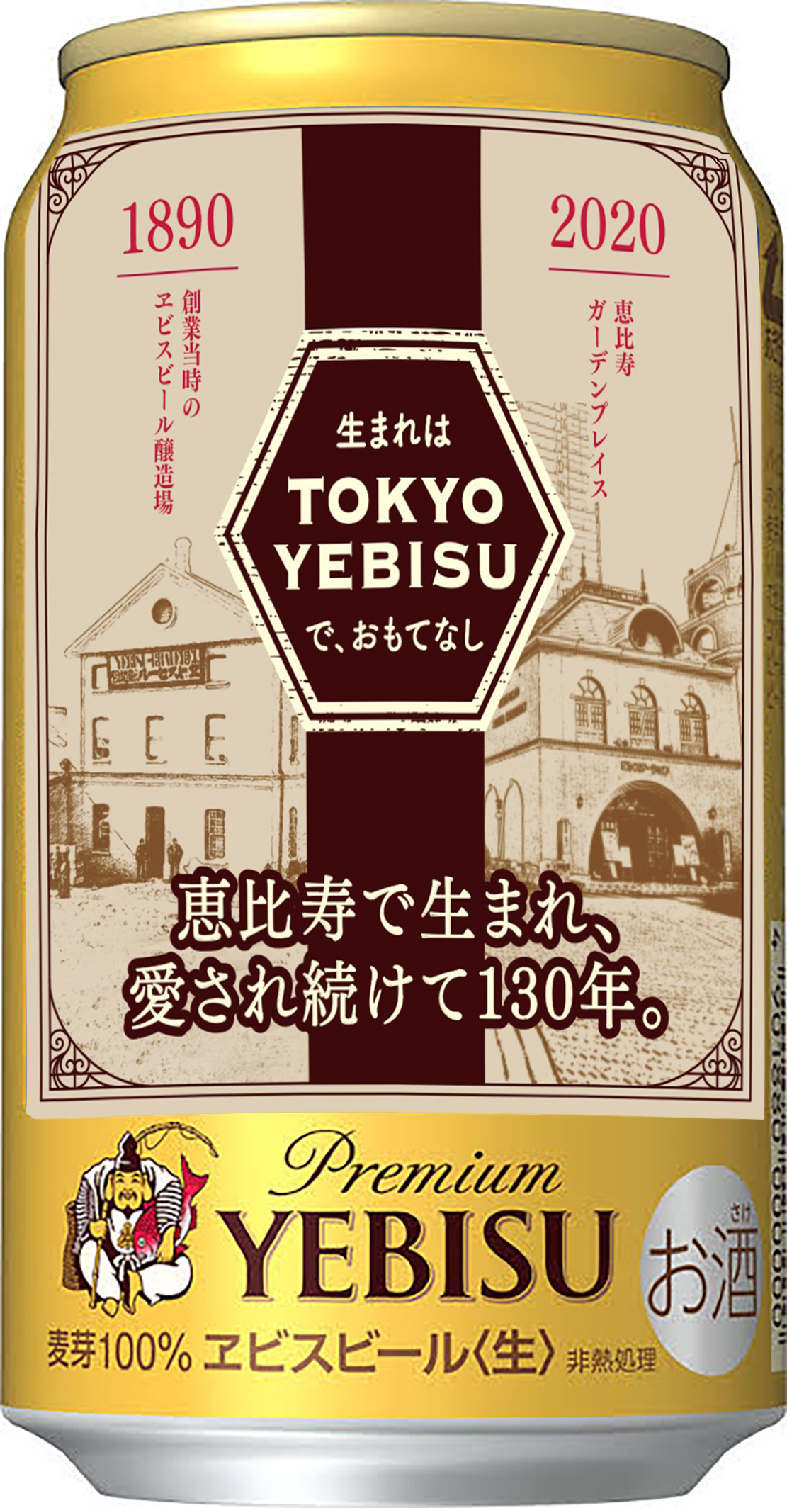 ・中央に「TOKYO YEBISU」のロゴマークを置き、1890年の創業当時のヱビスビール醸造場と、2020年の恵比寿ガーデンプレイスを対比的にデザインすることで、発売から130年を迎えた、ヱビスビールの歴史を象徴的に表現。