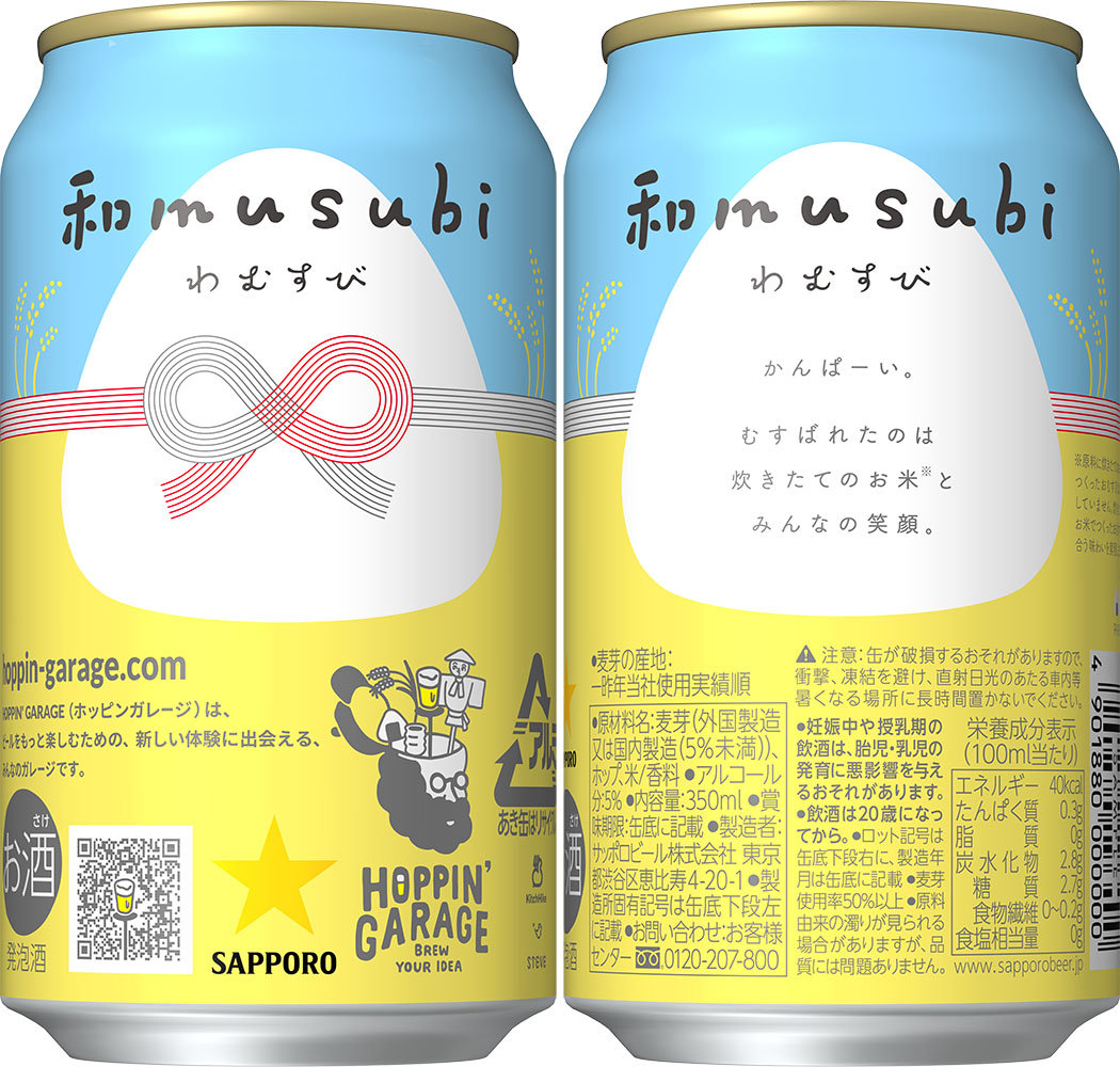 この商品は本年8月に発売した「HOPPIN' GARAGE ただいま!ビター」に続く、第7弾の商品で、「おむすびに合うビール」をテーマに掲げたビールテイスト(注1)です。原料に秋田県羽後町産のあきたこまちを使用しており、発売日以降、羽後町とタイアップして、「和musubi」を飲みながら総勢100名の参加者とおむすびを結ぶオンライン交流イベントを実施します。