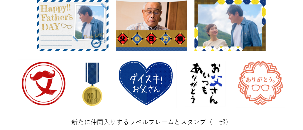 限定の新デザインラベルフレーム7種とスタンプ10種を加え、父の日限定のラベルフレームは全26種類、スタンプは全18種類からお選びいただけます。
