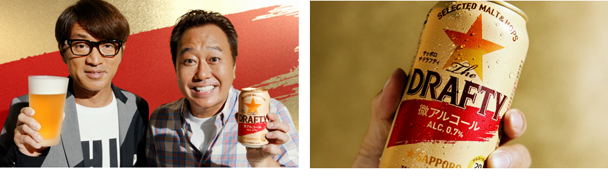 「サッポロ The DRAFTY」は、ビール好き(注1)のお客様の新しい選択肢として提案するアルコール度数0.7%の微アルコールビールテイスト飲料です。ビールを気兼ねなく楽しみたい気持ちがある一方で「健康志向」や「酔い過ぎたくない気持ち」の高まりを背景に、ビール好きが納得するおいしさを追求した商品です。