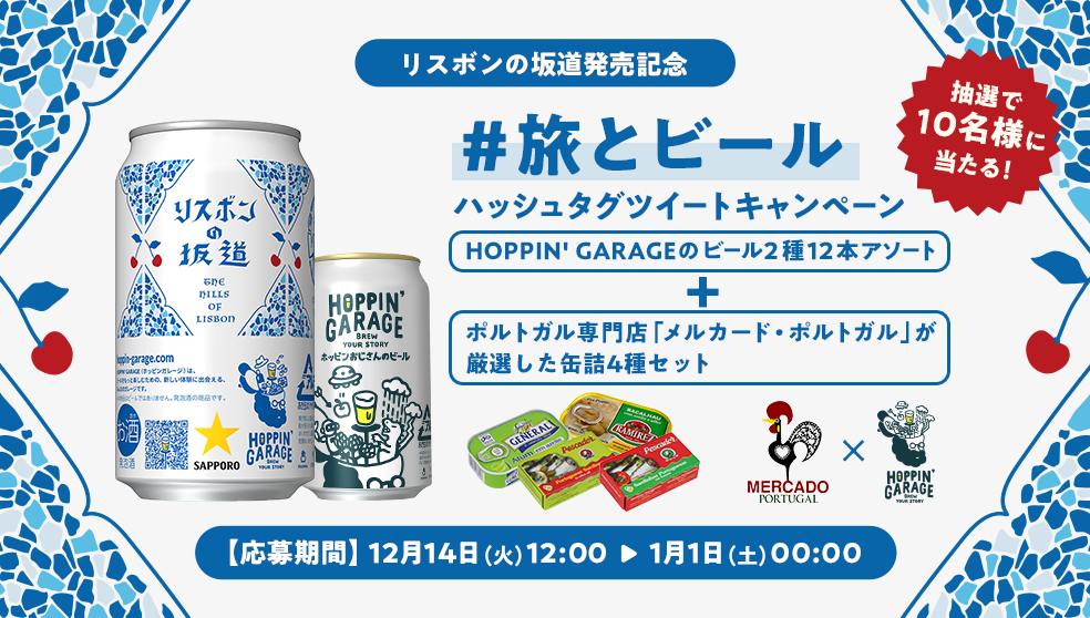 HOPPIN' GARAGE公式Twitterアカウントをフォローし、キャンペーン投稿を引用して、指定のハッシュタグ(#旅とビール)をつけて、あなたの「旅先で飲んだビールの思い出」をツイートしていただいた方の中から抽選で10名様に、ポルトガル専門店メルカード・ポルトガルが厳選した缶詰4種セットがついた「リスボンの坂道」アソートセットが当たります。