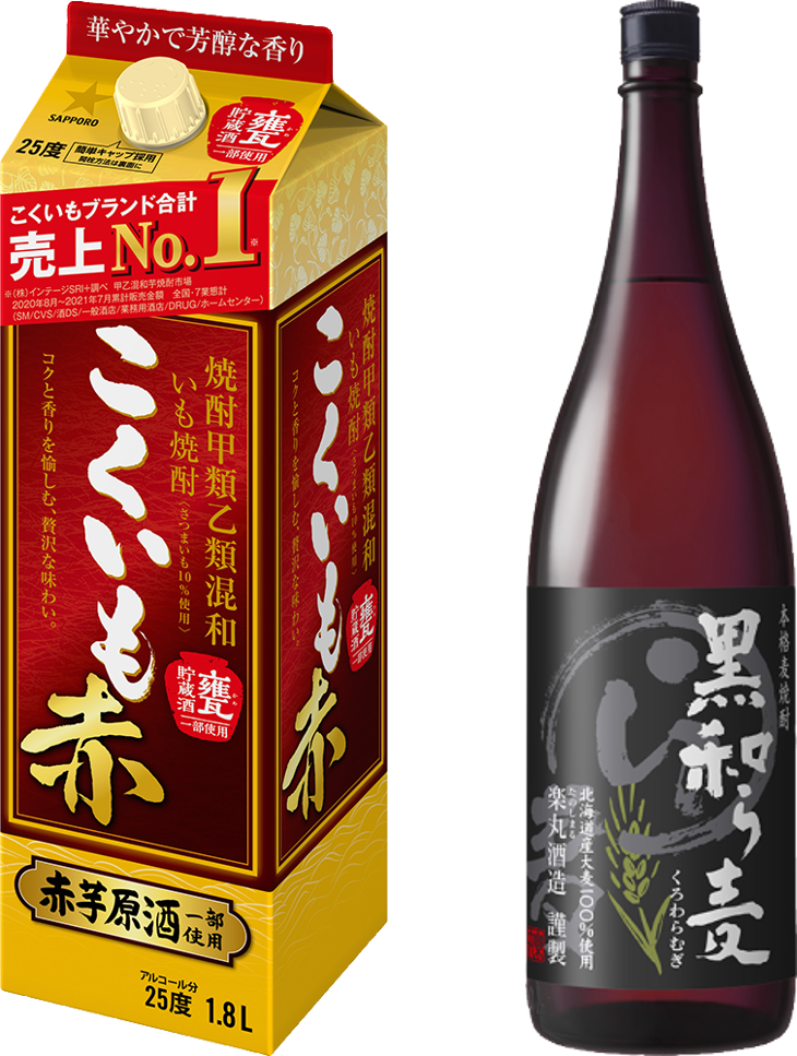 本年10周年を迎えた「甲乙混和芋焼酎 こくいも」ブランドから発売している「甲乙混和芋焼酎 こくいも赤 25度」は、赤芋由来の華やかな香りと甘みのある芳醇な味わいが特長です。また、福岡県久留米市田主丸町の蔵元「楽丸(たのしまる)酒造」が製造する「本格麦焼酎 和ら麦」から発売されている「本格麦焼酎 黒和ら麦 25度」は、原料のうまみを生かした芋のようなまろやかなコクがありながら、麦ならではのキレの良さが特長です。