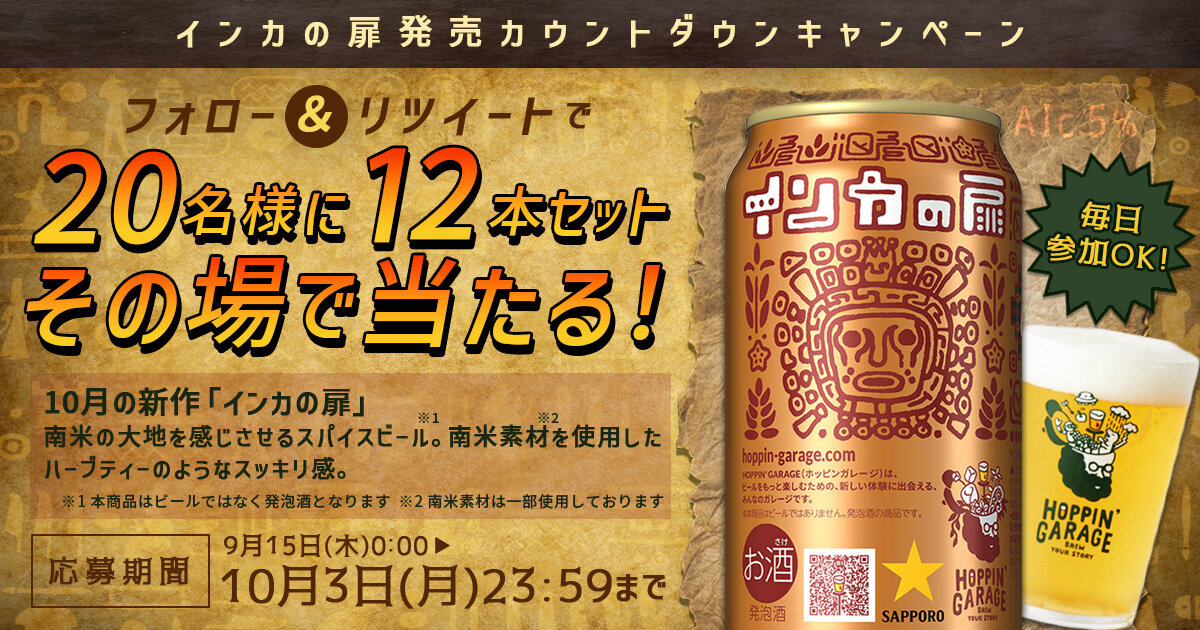 HOPPIN' GARAGE公式アカウントをフォローの上、キャンペーン投稿をリツイートしてくださった方の中から、抽選で20名様にインカの扉12本をプレゼントします。さらに参加者全員に「ホッピンおじさんの新作定