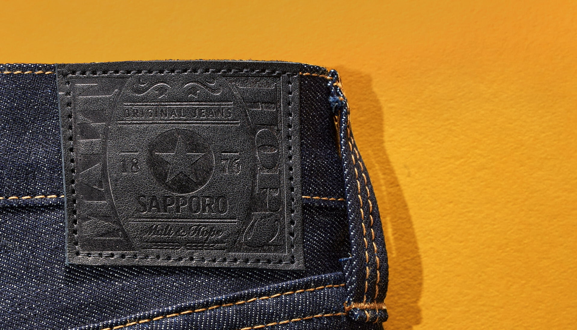 ビールづくりの工程で麦汁を搾ったあとに派生するモルトフィードや、ホップの収穫時に出る茎や葉など、ビールの副産物を、さとうきびのデニム製品への加工で知られるSHIMA DENIM WORKS(沖縄県浦添市)の技術で、沖縄県でパウダー化し、そのパウダーを岐阜県美濃市で「紙の糸」和紙糸に加工。広島県福山市の「ジーンズソムリエ」で、布にします。また、同じく広島県福山市の熟練の職人が、手作りで一つ一つサイズに合わせて仕上げます。黒ラベルのロゴと同じビールカラーのイエローステッチを新たに使用したJAPAN MADEのハンドメイドストレートジーンズです。