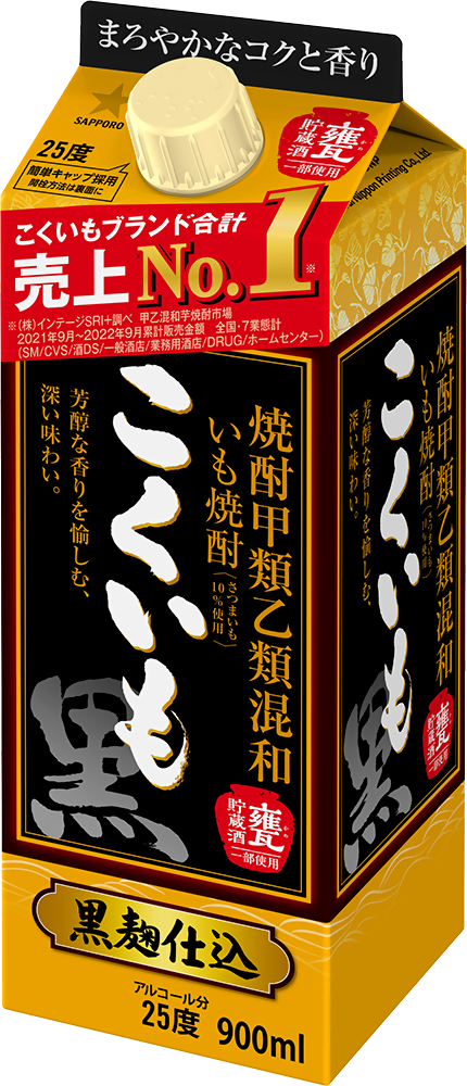 「甲乙混和芋焼酎 こくいも 25度」は、甕(かめ)貯蔵酒を一部使用した黒麹仕込本格芋焼酎と、クリアな味わいの甲類焼酎を絶妙なバランスでブレンドした、まろやかな芋の風味とすっきりとした飲み飽きない味わいが特長です。