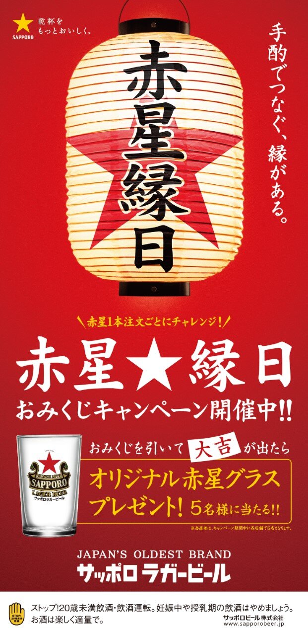サッポロビール(株)は、サッポロラガービールの赤星★縁日おみくじキャンペーンを、サッポロラガービール取り扱い店(注1)で5月22日から6月30日まで実施します。