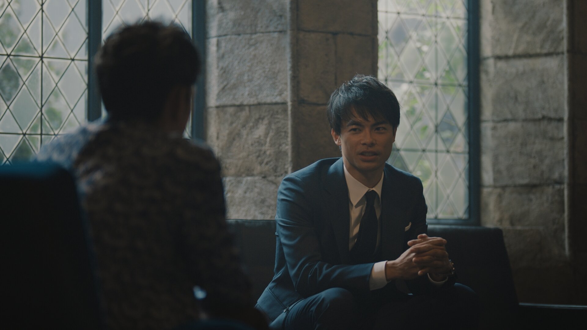階数表示が“26”を指し、エレベーターの扉が開く。そこで妻夫木さんを待っていたのは1台のタクシー。たち込める霧の中を進むタクシーは、やがて古城ホテルへと行き着きます。妻夫木さんが中へ入ると、そこにソファに座っている三笘さんの姿が。モダンな家具がセンスよく使われたホテルのロビーでお二人の会話は始まります。妻夫木さんの質問に、最初は緊張した面持ちで、ゆっくりと丁寧に自分の言葉を紡ぐ三笘さん。しかし5分もしないうちに、あっという間に距離感が縮まっていく二人。三笘さんが妻夫木さんに質問をする場面も多々あり、終始、会話が弾んでいました。収録の合間では、革靴を履いているのにも関わらず巧みなボール捌きを披露する三笘さんの姿も。妻夫木さんをはじめ全スタッフの目が釘付けになる、贅沢な時間がそこには流れていました。