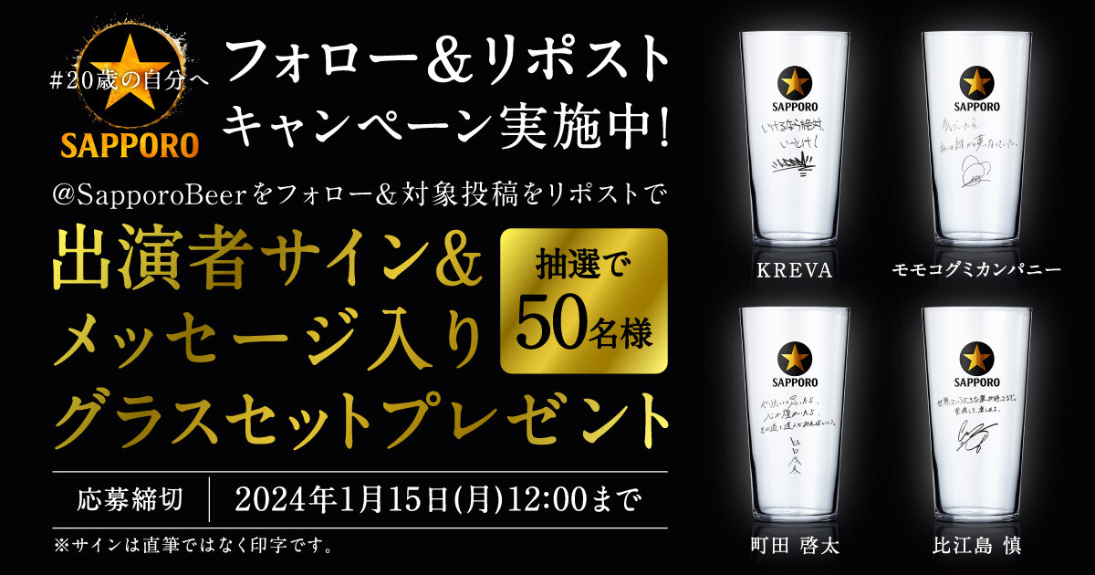 キャンペーン期間中にサッポロビール公式Xアカウント(@SapporoBeer)から投稿されるキャンペーン投稿をフォロー&リポストすると、抽選で50名様に「#20歳の自分へ」スペシャルインタビュー企画出演の4名のサインとメッセージが入ったオリジナルグラス4個セットが当たります。