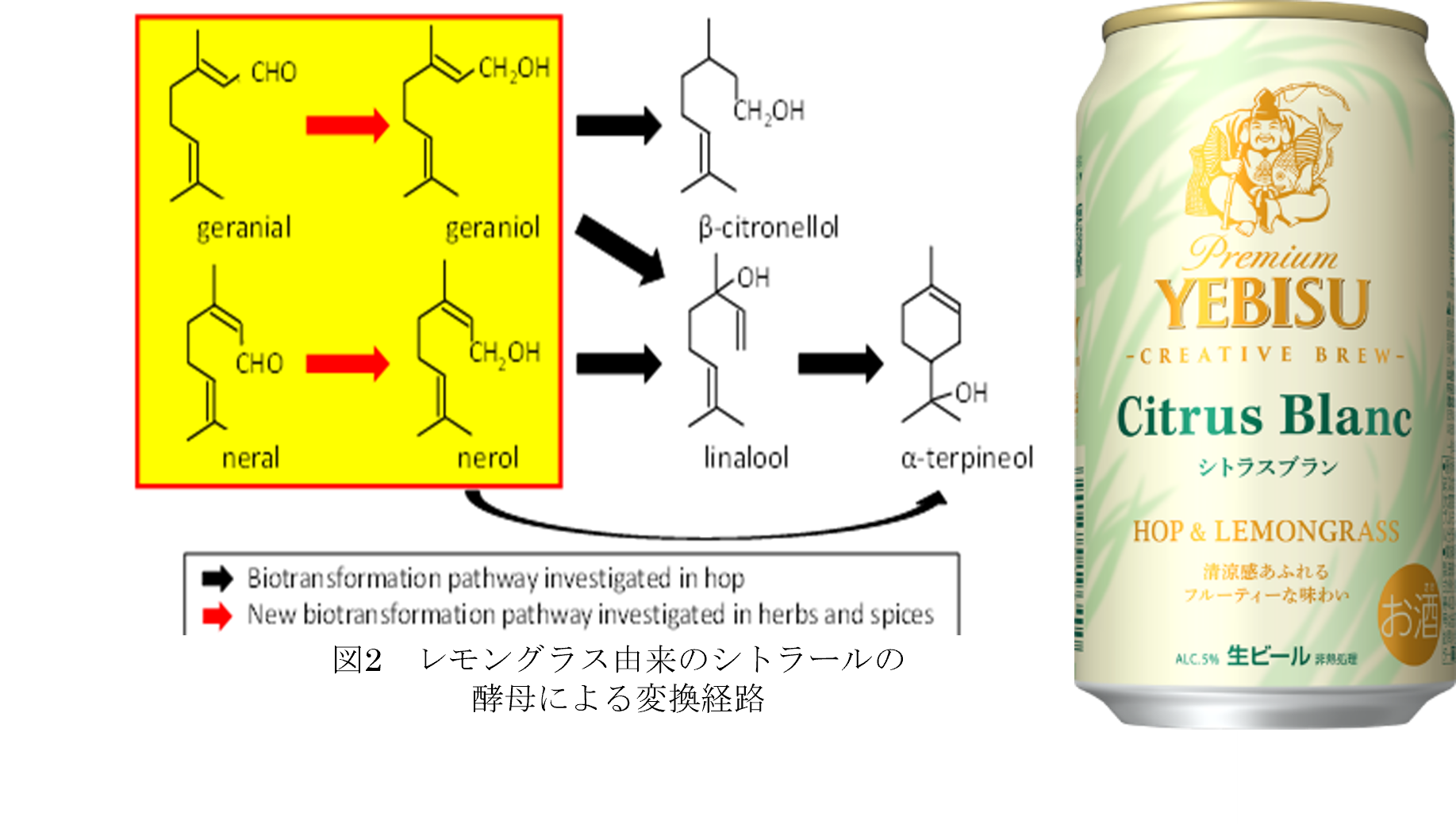 2000年代以降に世界的にも注目されているクラフトビールには、特長的な香り成分を持つホップやハーブ、スパイスなどが使われています。2017年の酒税法改正では、そういったハーブやスパイス、果汁等がビールの副原料として認められました。当社は、それらの香り成分が醸造中に酵母の作用によって変換され、ホップの品種、スパイスやハーブの種類、さらにはその組み合わせによって特長的な香りのビールになることを解明しました。2024年2月20日に発売した「ヱビス シトラスブラン」(注3)では、よりレモンのような香りを引き立たせるため、この研究を応用して商品開発につなげました。