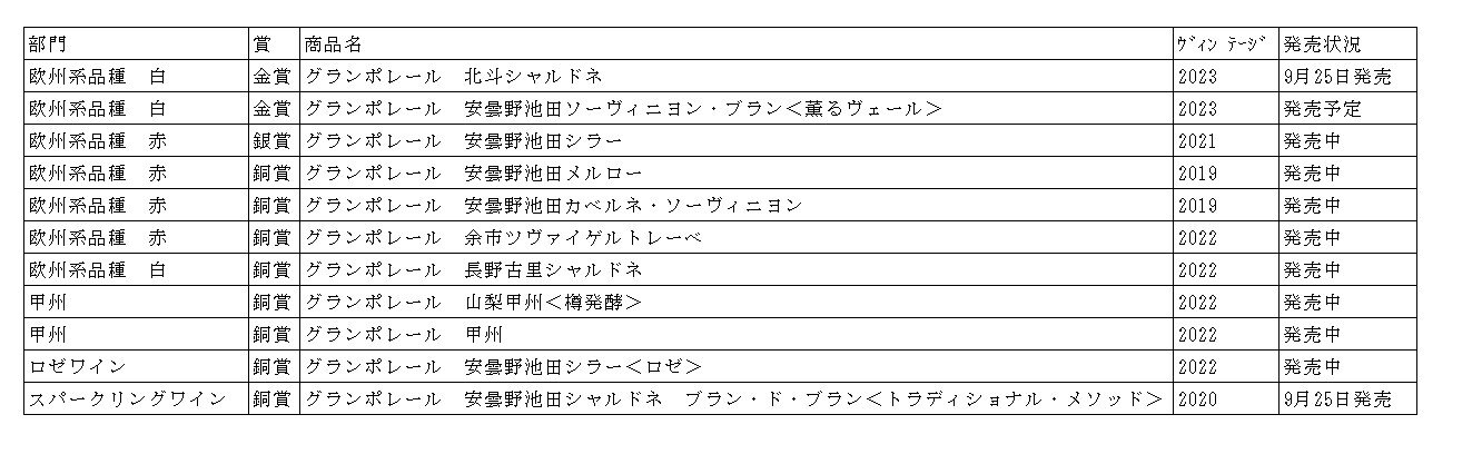 また、欧州系品種・赤部門で銀賞を受賞した「グランポレール 安曇野池田シラー2021」など、金賞2アイテム、銀賞1アイテム、銅賞8アイテムと計11アイテムが各賞に輝きました。