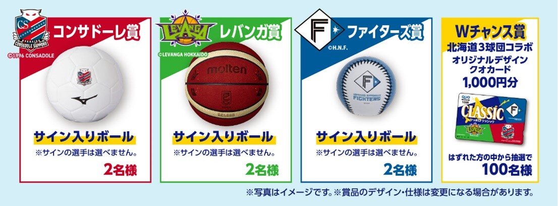 北海道に本拠地を置く「北海道コンサドーレ札幌」、「北海道日本ハムファイターズ」、「レバンガ北海道」とのコラボグッズが当たるキャンペーンを実施