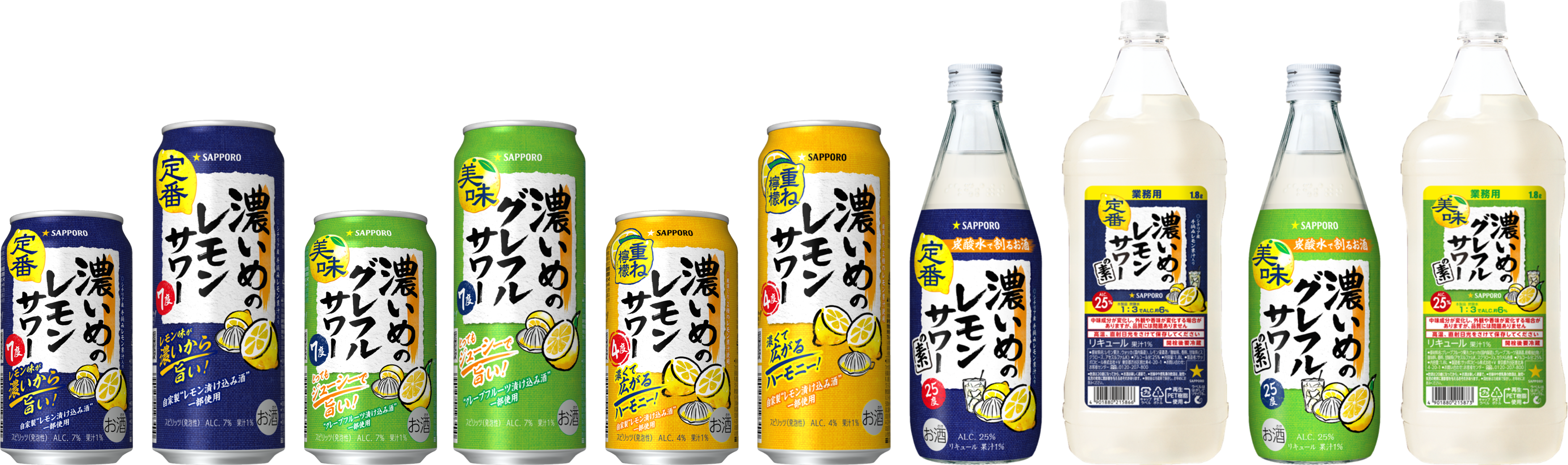 サッポロビール(株)はRTD(注1)商品「サッポロ 濃いめのレモンサワー」「サッポロ 濃いめのレモンサワー 重ね檸檬」「サッポロ 濃いめのグレフルサワー」を11月製造分より、RTS(注2)商品「サッポロ 濃いめのレモンサワーの素」「サッポロ 濃いめのグレフルサワーの素」を12月製造分より順次リニューアル(注3)します。