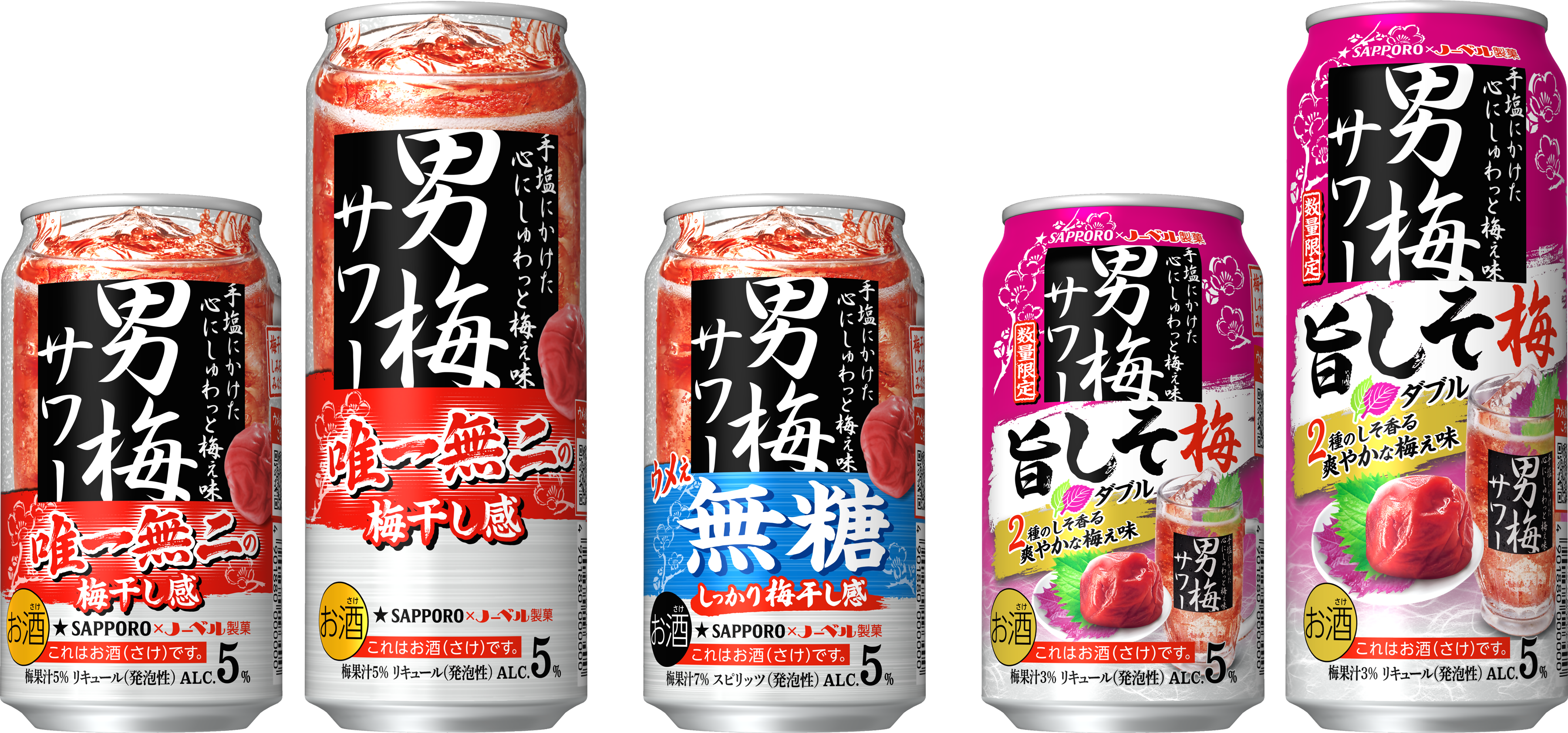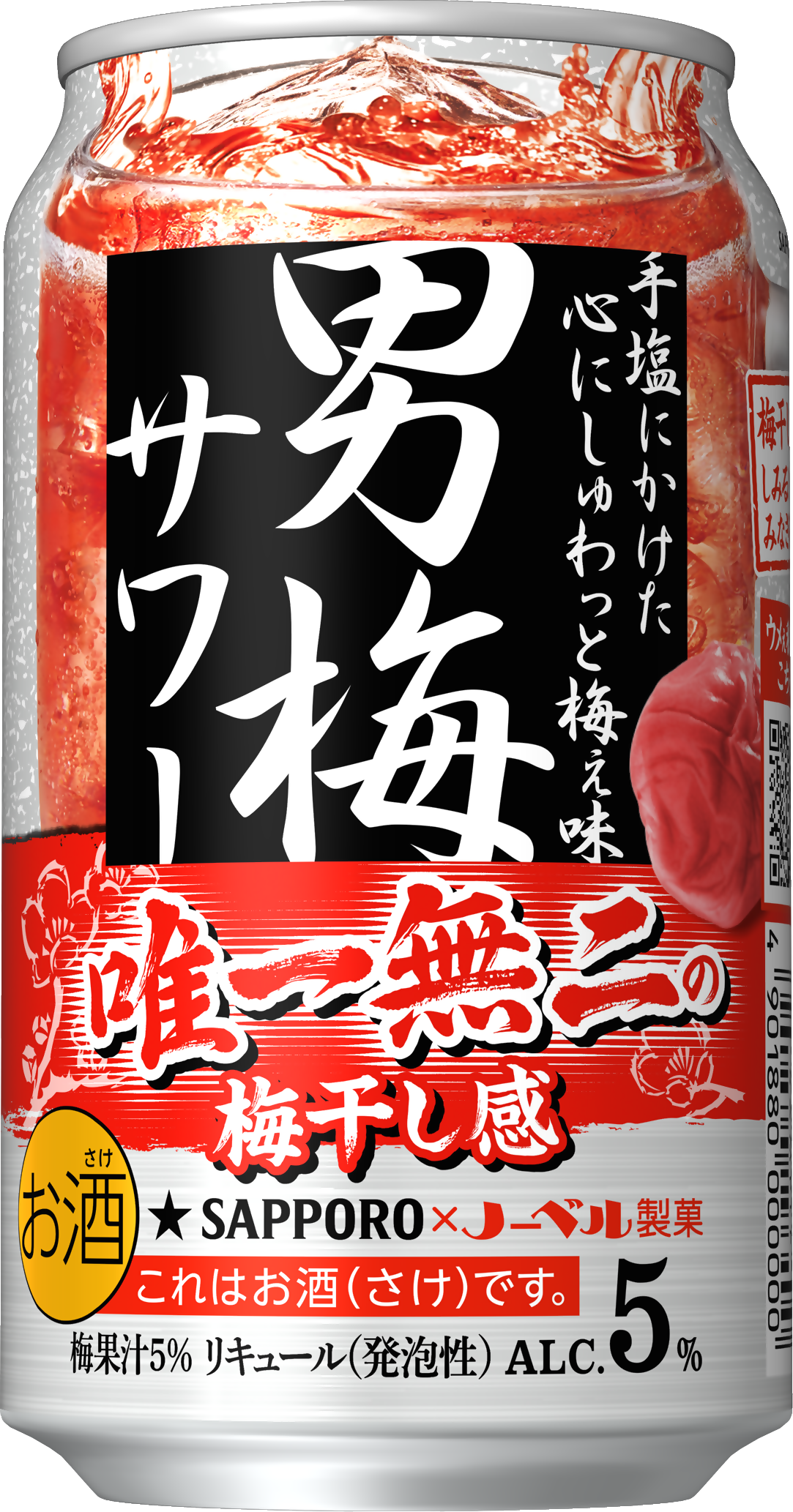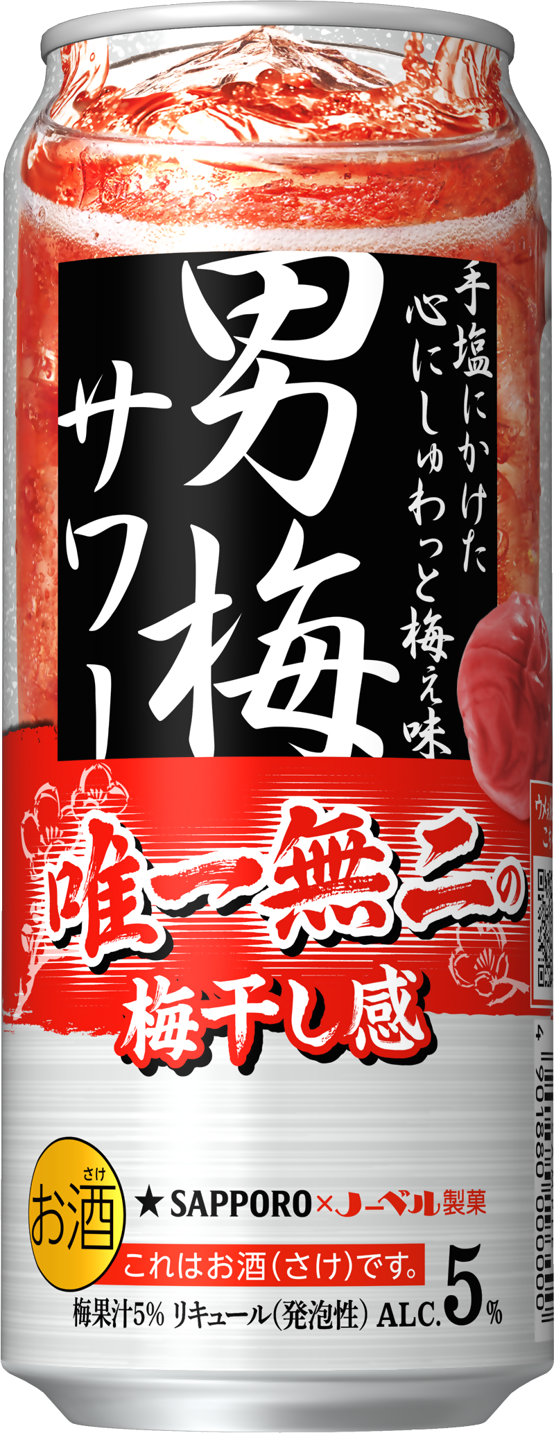 「男梅サワー」は、ノーベル製菓株式会社が販売する「男梅」の風味を再現した、サッポロビールとノーベル製菓のコラボレーション商品です。当社だけが使用している梅干しまるごと粉砕浸漬酒により、その味と香りを余すことなく封じ込めました。