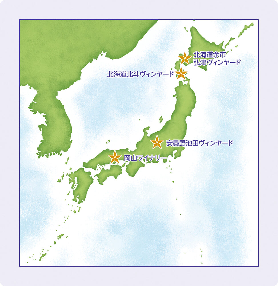 南北に長く、複雑な地形を有する日本では、地域によって気候や風土が異なり、主な産地としては、北海道、山形、長野、山梨、岡山などがあり、その土地ならではの多様なぶどうが栽培され、個性豊かなワインが数多く造られています。21世紀に入ってから、国内でも国産ワインのみのコンクールが初めて開催され、今日では、海外のコンクールでも受賞するほど、その優れた品質が高く評価されています。