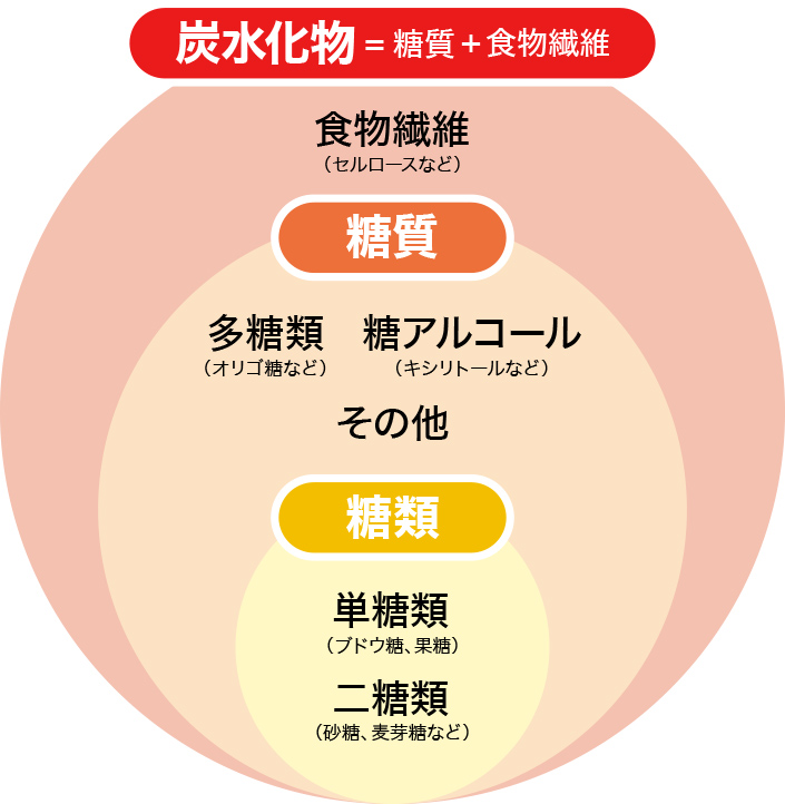 糖質とは、炭水化物から食物繊維を除いたものの総称であり、糖類、多糖類、糖アルコールなどから構成されます。糖類とは、糖質から三糖類以上の多糖類、糖アルコールなどを除いたものであり、単糖類と二糖類の総称です。