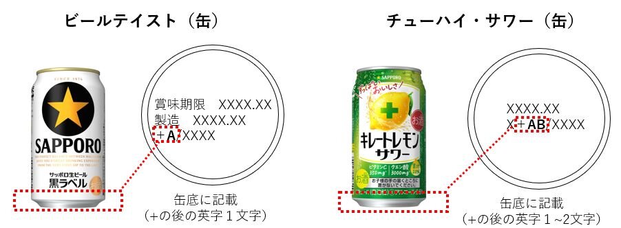 商品の製造場所は、製造所固有記号として、容器(缶の底面など)に「+」を冠したアルファベットで表示しています。サッポロビールホームページ【製造所固有記号一覧】から製造者の名称、製造所の所在地をご確認いただけます。