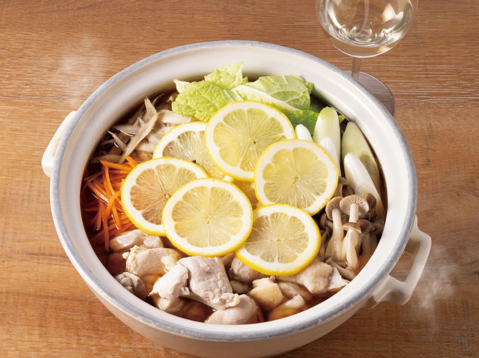 鶏肉に火が通ったらにんじんとレモンスライスをのせる。 - ひと煮立ちしたらできあがり!