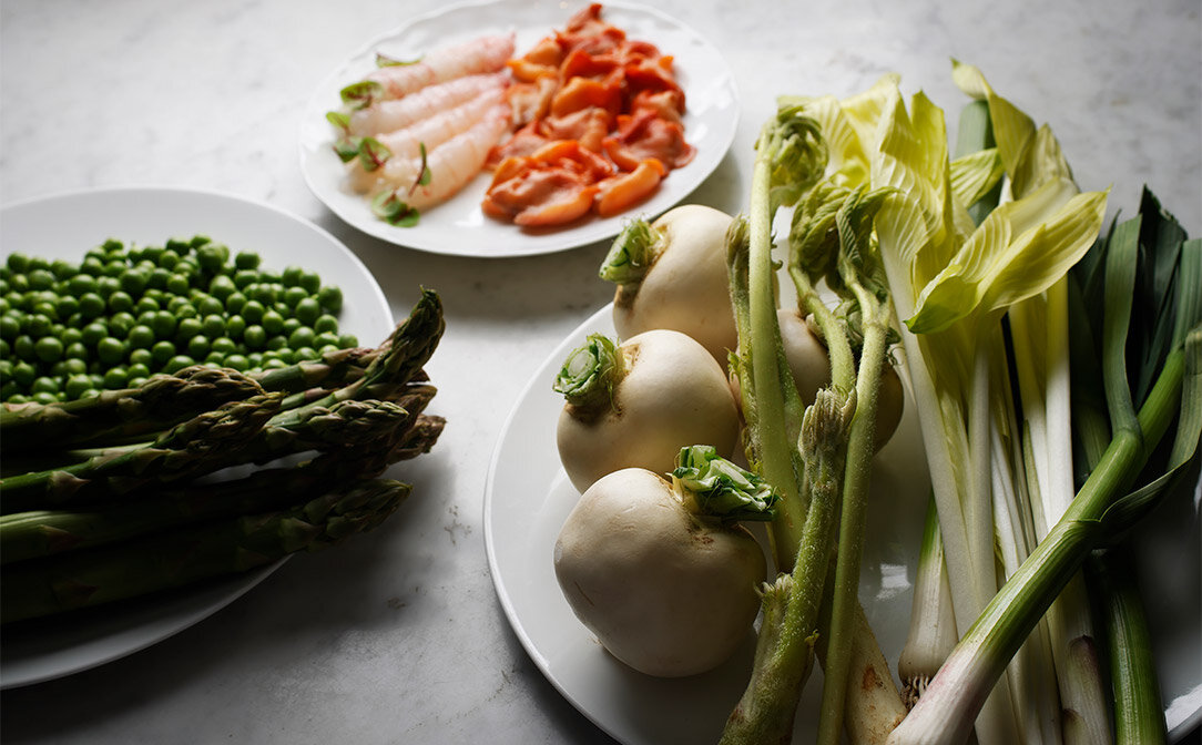アスパラガスとグリーンピースは甘味と風味の濃いイタリア産。山菜はあえて栽培ものを選び、若いヴィンテージシャンパーニュの特徴でもある渋味と調和させ、食感にアクセントをプラス。