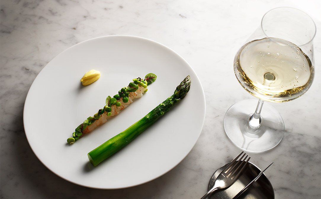 香りを閉じ込めたグリーンアスパラガスのボイル、表面を軽く炙ったボタンえびとグリーンピースのタルタルで構成するシンプルな前菜。ターメリック、ライム、シャルトリューズを練り込んだサワークリームを付け合わせに添え、“味変”を楽しめる仕立てに。