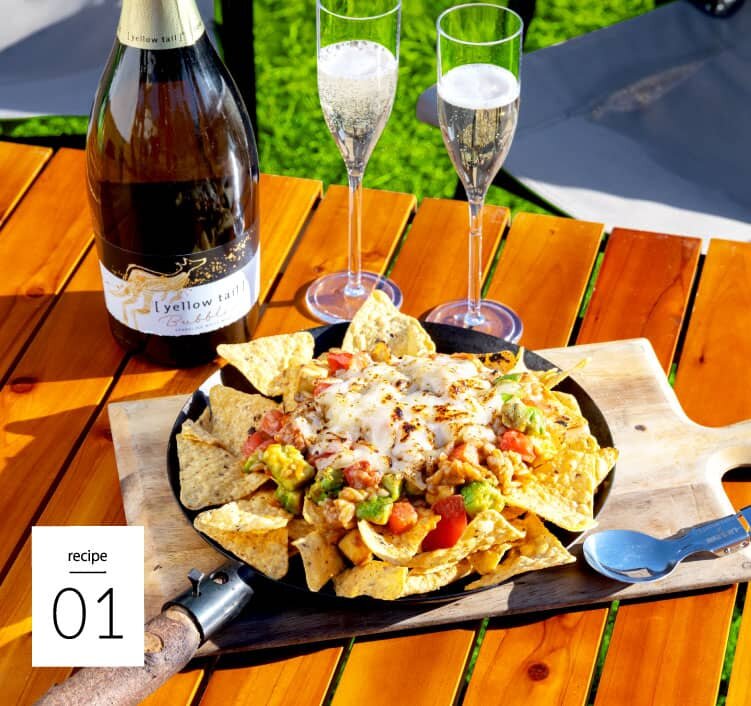とりあえず乾杯!キャンプのはじまりのおつまみにふさわしい手軽なチップスには、乾杯にピッタリな[イエローテイル]バブルス・ドライをチョイス。シュワシュワと喉越しのよい発泡ワインは、テントの設営を終えたあとの一杯にもぴったりです。「銀座カリー中辛」のピリッとした味わいのナチョスと爽やかなスパークリングワインで、キャンプもバーベキューも盛り上がります。