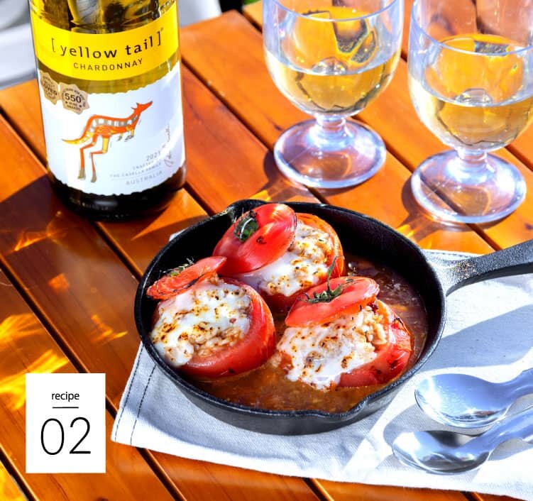 くり抜いたトマトにハヤシライスを詰めて焼いたファルシーは、コクがあり、メインにもなりそうなしっかりめの味。爽快感がありながらまろやかな味わいの[イエローテイル]シャルドネと合わせると、焼いたトマトのうま味と酸味が一層引き立ちます。キリッと冷やしたシャルドネに、熱々のファルシーを頬張って。