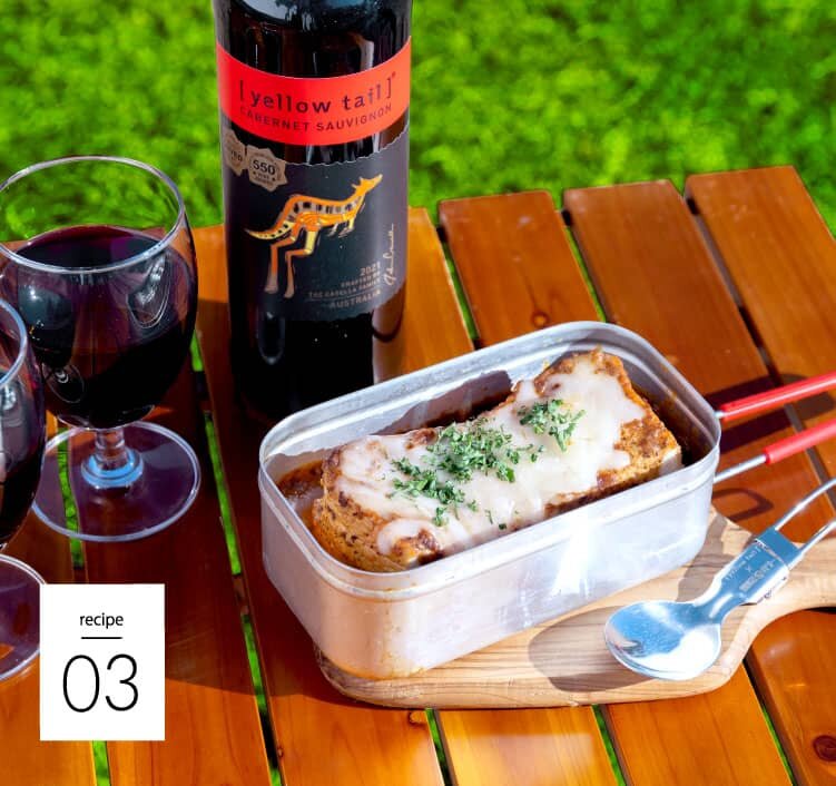 メスティンにパンをぎゅっと詰め、銀座キーマカリーでコトコト煮たグラタン。パンに染み込んだカレーが、噛むたびじゅわっと広がります。食べごたえがあるグラタンに合わせたのは、力強い果実味のある[イエローテイル]カベルネ・ソーヴィニヨン。芳醇なワインとカレーが外飲みのシチュエーションをより楽しくさせてくれます。